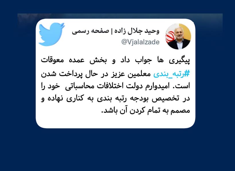 توییت دکتر جلال زاده درباره پرداخت معوقات رتبه بندی معلمین